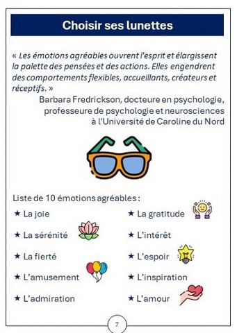 Alors oui a priori le ratio des émotions désagréables par rapport aux émotions agréables ne semble pas nous être très favorable. Détrompons-nous et changeons nos lunettes pour rentrer dans le champ de la psychologie positive et en particulier dans celui de l’incontournable Barbara Fredrickson. Selon elle, « les émotions agréables ouvrent l’esprit et élargissent la palette des pensées et des actions. Elles engendrent des comportements flexibles, accueillants, créateurs et réceptifs ». Chouette ! Elle a mis en lumière un cocktail d’émotions agréables. Je ne sais pas vous, mais moi, j’ai très envie d’y goûter.